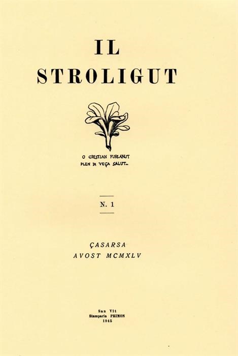 Il Stroligut: n. 1, Çasarsa, avost MCMXLV. Çasarsa: [Academiuta di lenga furlana], 1945, (San Vit: Stamparia Primon). IV, 35 p., [3] carte di tav., ill., 24 cm.