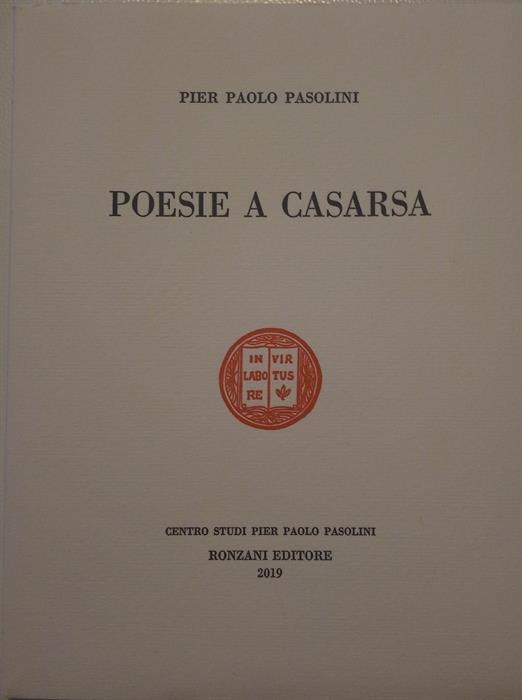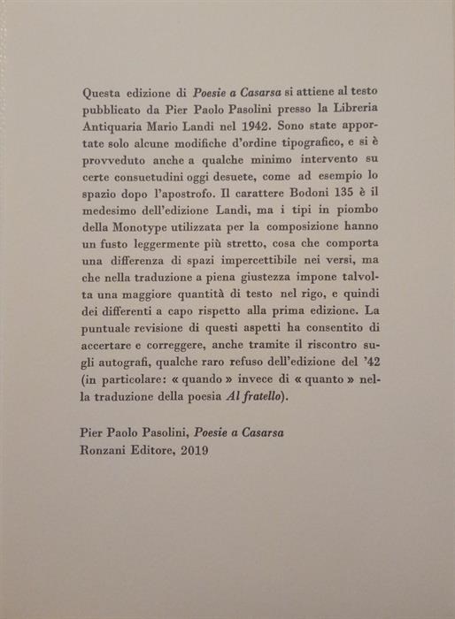 EDZPasolini, Pier Paolo. Poesie a Casarsa. [Ed. tipografica]. [Casarsa della Delizia]: Centro studi Pier Paolo Pasolini; [Monticello Conte Otto]: Ronzani, 2019, (Milano: Tipografia Campi Monotype 1898, 18 gennaio 2019). 42 p., 20 cm.